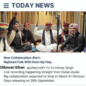 हमारे राजस्थानी गायक दुबई में सुपरस्टार हनी सिंह के साथ नया गीत रिकॉर्ड कर रहे हैं। कुछ ही दिनों में शानदार कॉन्सर्ट होने वाला है—इस जबरदस्त सहयोग का हिस्सा बनने के लिए तैयार रहिए!